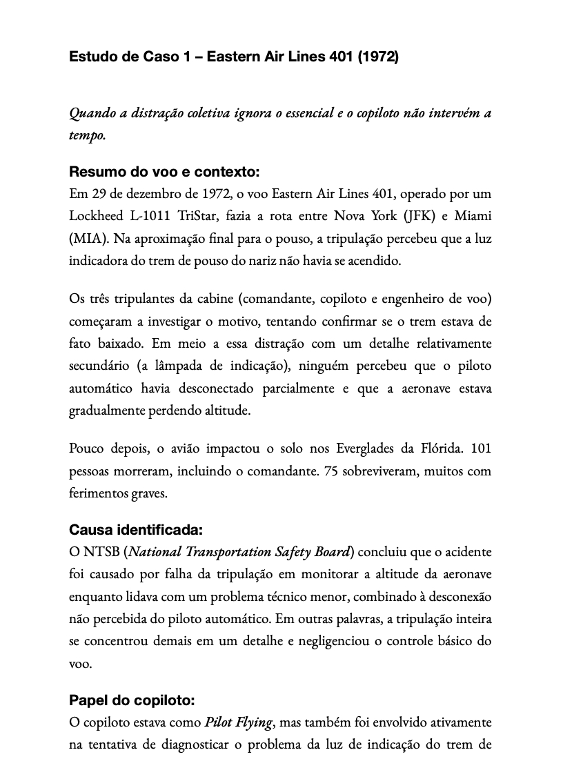Baseado em experiências reais e estudos de caso de incidentes e acidentes aéreos, o livro revela lições valiosas sobre liderança, comunicação, colaboração e atenção aos detalhes.
